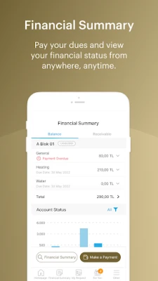 Finansal şeffaflık Aktif Yaşam Hizmet Yönetimi'nin temel taşlarından biridir. Güncel aidat durumunuzu ve tüm finansal hareketlerinizi kolayca gözden geçirebilir, ödeme takibinizi rahatlıkla yapabilirsiniz. Ayrıca, yaşam alanınızla ilgili alınan en güncel yönetim kararlarına ve önemli duyurulara anında ulaşarak her zaman bilgi sahibi olursunuz. Evinizde bir arıza meydana geldiğinde, örneğin bozuk bir musluk, Aktif Yaşam Hizmet Yönetimi üzerinden hızlıca bir iş talebi oluşturabilir ve talebinizin ilerleyişini adım adım takip ederek çözüm sürecine doğrudan dahil olabilirsiniz.
