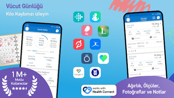 Sağlık yolculuğunuzu daha da ileri taşımak isteyenler için "Vücut Ölçüm ve Kilo Verme İzleyici", otomatik yedeklemeler, şifreli ekran kilidi, çeşitli uygulama temaları ve ek profil oluşturma gibi gelişmiş seçenekler sunar. Ayrıca, Android Health Connect entegrasyonu (beta aşamasında) ile adım sayısı, aktivite, yakılan kalori, su tüketimi, uyku düzeni ve adet döngüsü gibi sağlık verilerinizi sorunsuz bir şekilde birleştirerek bütünsel bir bakış açısı kazanmanızı sağlarız. Selantoapps olarak, sürdürülebilir bir yaşam tarzı değişikliğinin önemine inanıyor, uzmanların önerdiği gibi haftada 1 kg'dan fazla kilo vermemenizi tavsiye ediyoruz. Her geri bildirime değer veriyor ve sizden gelen her yorumla uygulamamızı daha da geliştiriyoruz. Sağlık dönüşüm yolculuklarında bize katılan 1.104.482 kişinin her biri, bizim için bir ilham kaynağıdır.