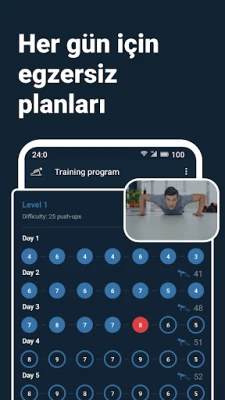 Fitness hedeflerinize ulaşmak, kilo vermek veya kas kütlesi inşa etmek mi istiyorsunuz? Gücünüzü keşfetmenize ve en iyi formunuza kavuşmanıza yardımcı olacağız. Şınav, sadece göğüs ve kol kaslarını değil, omuz kuşağını, karın bölgesini ve genel fiziksel dayanıklılığı hedef alan, tüm vücudu çalıştıran temel bir egzersizdir. Kondisyon seviyeniz ne olursa olsun, evinizin konforunda veya dilediğiniz herhangi bir yerde, özel ekipmanlara veya kişisel bir eğitmene ihtiyaç duymadan, tamamen size özel günlük antrenman programlarıyla hedeflerinize emin adımlarla ilerleyebilirsiniz. Uygulamamız, zaman ve enerji verimliliğini ön planda tutarak en etkili seansları sunar.