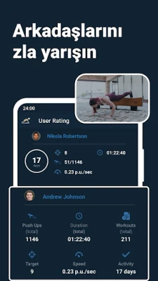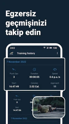 Egzersiz yolculuğunuzda en büyük destekçiniz olacak bu dijital asistan, her şınavınızı akıllıca takip eder. Telefonunuzu göğüs hizasında yere konumlandırdığınızda, entegre yakınlık sensörü sayesinde şınavlarınız otomatik olarak sayılır, böylece tek odak noktanız egzersiziniz olur. Dilerseniz, antrenman verilerinizi manuel olarak da girebilirsiniz. Dahili profesyonel koçluk özelliği ile her gün değişen zorluk seviyelerinde, tamamen size uygun antrenman planlarına erişirsiniz; uygulama, güncel performansınıza göre en ideal seviyeyi sizin için belirler. Ayrıca, yakılan kaloriler, şınav hızı ve toplam egzersiz süresi gibi önemli metrikleri detaylıca hesaplayarak performansınızı objektif bir şekilde değerlendirir.